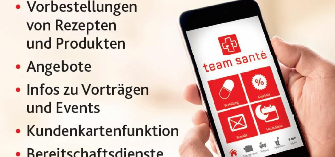 Die neue Team Santé App informiert Sie aktuell über die neuesten Angebote in Ihrer Apotheke. Haben Sie Interesse an informativen Vorträgen und spannenden Events zu den Themen Gesundheit, Wohlbefinden und Neuigkeiten aus der Welt der Medizin? Mit unserer App entgeht Ihnen kein interessanter Termin mehr!